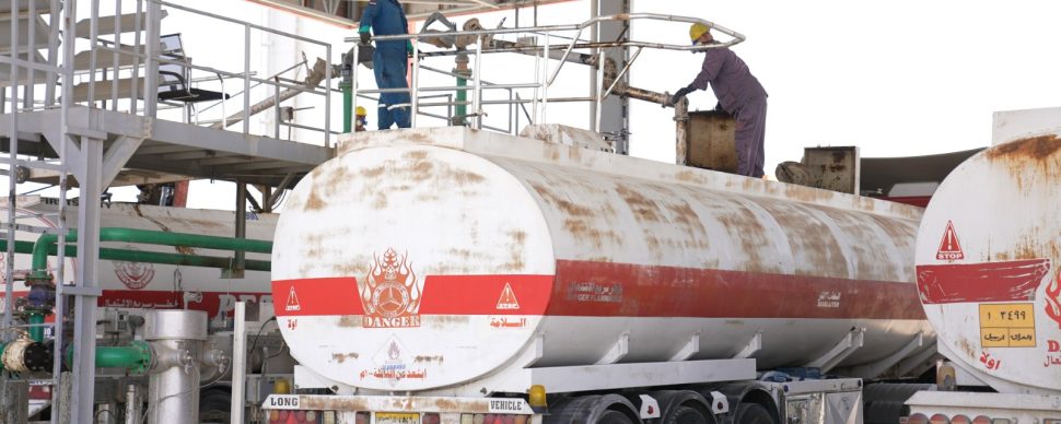 Workers pump heavy crude into tanker trucks at the Qayarah oil field in Ninewa province on May 8, 2023. (Photo credit: Oil Ministry)