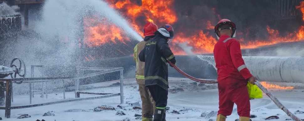 Fire fighters and civil defense corps members extinguish the fire at the Zubair-1 pumping station following a gas leak explosion on Oct. 26, 2025.