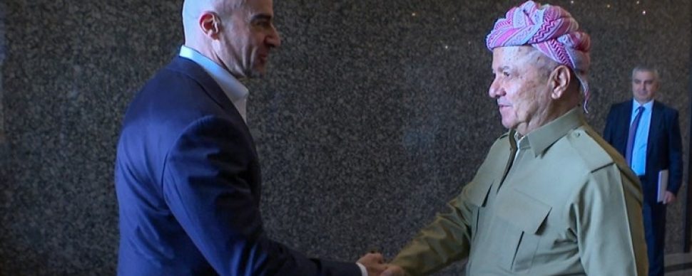 PUK President Bafel Talabni (left) meets with KDP President Massoud Barzani (right) on Sept. 27, 2025. (Photo credit: KDP presidency office)