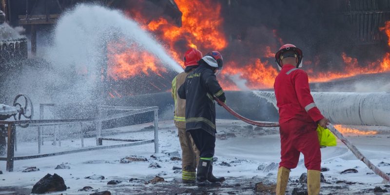 Fire fighters and civil defense corps members extinguish the fire at the Zubair-1 pumping station following a gas leak explosion on Oct. 26, 2025.