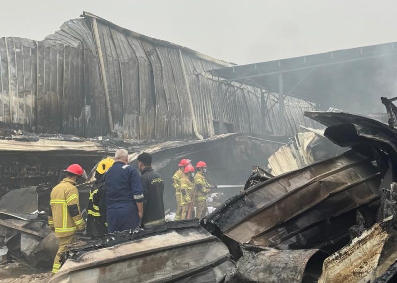 Emergency personnel gather at the site of a drone strike on a warehouse near North Rumaila on April 4, 2026. (STAFF/Iraq Oil Report)
